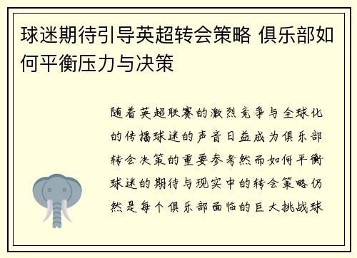 随着英超联赛的激烈竞争与全球化的传播,球迷的声音日益成为俱乐部转会决策的重要参考。然而,如何平衡球迷的期待与现实中的转会策略,仍然是每个俱乐部面临的巨大挑战。球迷希望通过转会市场获得更强的阵容和更具竞...