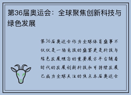 第36届奥运会:全球聚焦创新科技与绿色发展