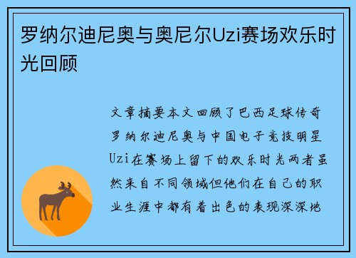 文章摘要:本文回顾了巴西足球传奇罗纳尔迪尼奥与中国电子竞技明星Uzi在赛场上留下的欢乐时光。两者虽然来自不同领域,但他们在自己的职业生涯中都有着出色的表现,深深地影响了球迷和粉丝。罗纳尔迪尼奥凭借其在...