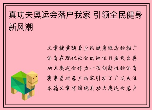 文章摘要:随着全民健身理念的推广,体育在现代社会的地位日益突出。真功夫奥运会作为一项创新性的体育赛事,首次落户“我家”引发了广泛关注。本篇文章将围绕“真功夫奥运会落户我家,引领全民健身新风潮”这一主题...